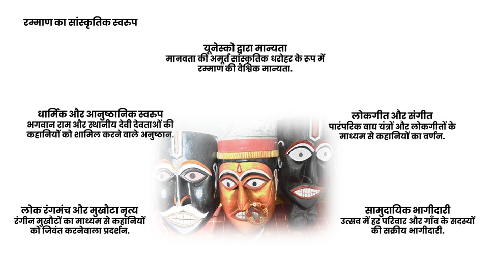 यूनेस्को द्वारा मान्यता: 2009 में, यूनेस्को ने रम्माण को मानवता की अमूर्त सांस्कृतिक विरासत की प्रतिनिधि सूची में शामिल किया। यह मान्यता इस बात का प्रमाण है कि यह उत्सव न केवल एक गाँव की परंपरा है, बल्कि यह वैश्विक सांस्कृतिक महत्व रखता है। यह मान्यता इस परंपरा को बचाने और संरक्षित करने के प्रयासों को प्रोत्साहित करती है।