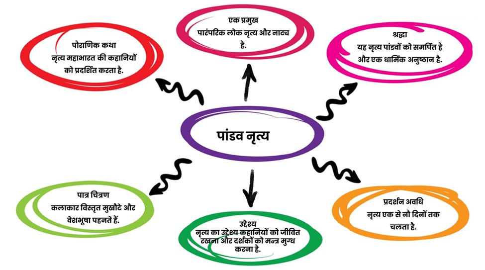 महाभारत का नाट्य रूपांतरण: पांडव नृत्य का मुख्य उद्देश्य महाभारत की कहानियों को जीवंत करना है। इसमें नर्तक पांडवों, द्रौपदी और अन्य पात्रों का रूप धारण करते हैं और युद्ध, वनवास और अन्य महत्वपूर्ण घटनाओं का अभिनय करते हैं। यह नृत्य पीढ़ी दर पीढ़ी मौखिक परंपरा के माध्यम से महाभारत की कहानियों और नैतिक शिक्षाओं को आगे बढ़ाता है, जिससे यह इतिहास का एक चलता-फिरता संग्रहालय बन जाता है।
